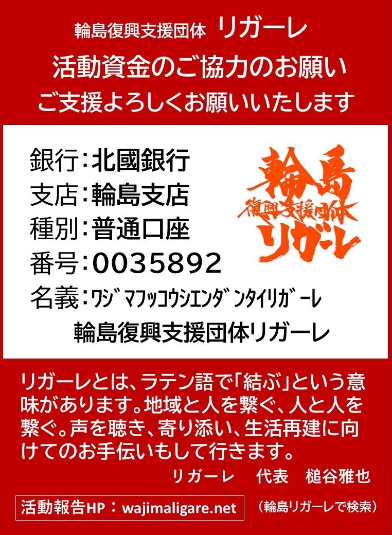 輪島復興支援団体リガーレとは お問い合わせ ご依頼及び業務内容へのご質問などお気軽にお問い合わせください 090-5412-3603電話でのお問い合わせはこちら メールでのお問い合わせお気軽にお問い合わせください 支援金の趣旨説明 ご支援いただける方は、下記のフォームからお名前・メールアドレスなどをお知らせください。御礼を兼ねて、近況をご報告いたします。 必須お名前 必須メールアドレス 任意メッセージ こちらのボックスにチェックを入れてから送信してください。 Δ 活動記録 wajimaligare 輪島復興支援団体リガーレは、令和6年1月1日に発生した能登半島地震で被災した輪島市民によって、同年10月1日に設立した団体です。 リガーレとは、ラテン語で「結ぶ」という意味があります。地域と人を繋ぐ、人と人を繋ぐ。声を聴き、寄り添い、生活再建に向けてのお手伝いもして行きます。 10月8日 #災害復興支援チームいいすま 10月4日 本日は、2班に分かれて活動。 9月27日 本日は、 富山大学・神戸市社 9月18日 本日は、#コネクト さんから3 9月15日 #災害復興支援チームいいすま さらに読み込む Instagram でフォロー FacebookX